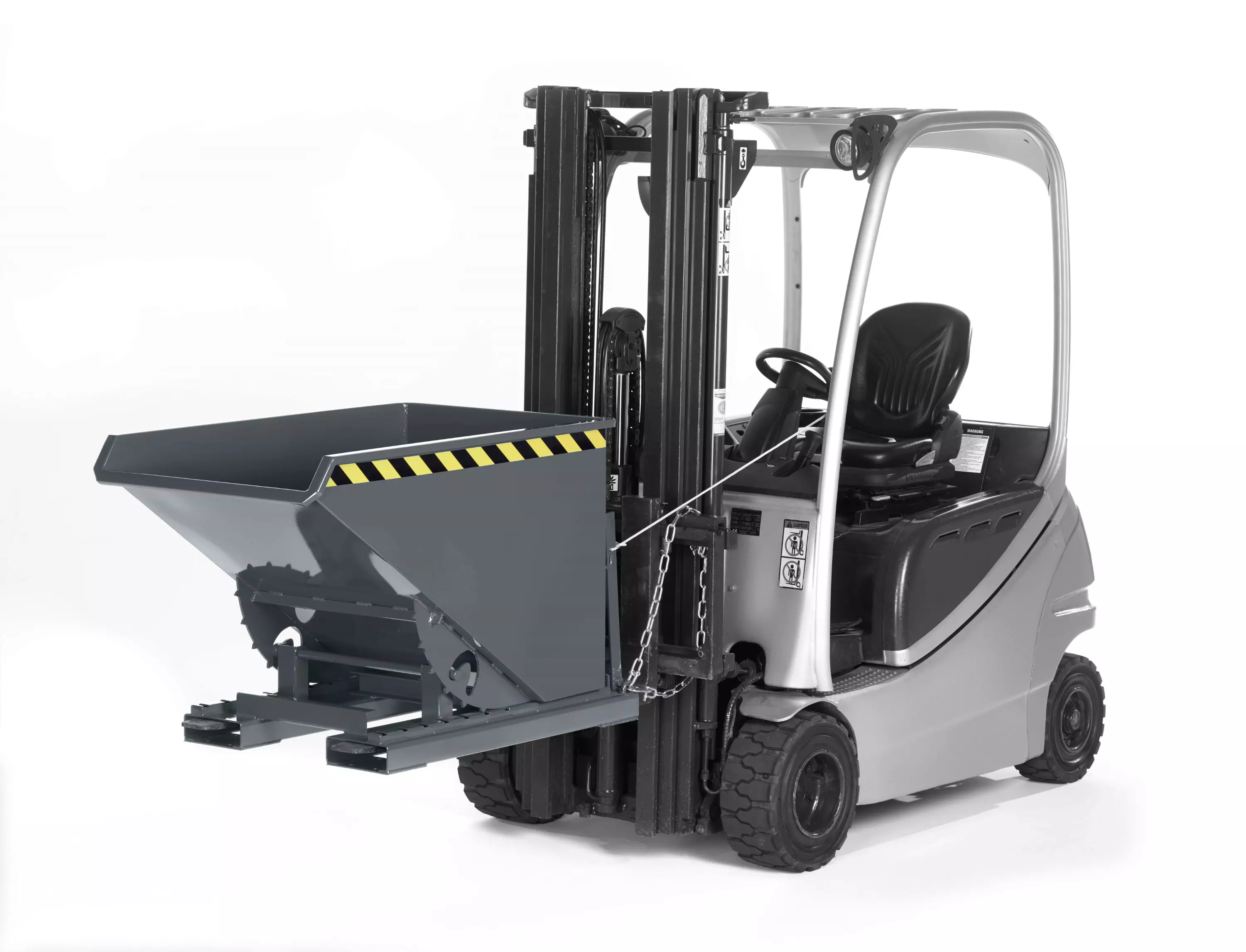 Der Abrollkippbehälter ist die optimale Lösung für den Transport und sammeln von Schüttgütern jeglicher art. Durch den günstigen Lastschwerpunkt und der Abrollmechanik ist eine reibungslose Entleerung der Schüttgüter möglich. Eine Entriegelung per Seilzug vom Fahrersitz macht die Entleerung für den Fahrer bequem und einfach. Der Abrollkipper besitzt zusätzlich eine Kettensicherung, die das Abrutschen von den Gabeln verhindert. Der Abrollkipper ist robust und langlebig dank einer umlaufenden Randverstärkung und einem verstärkten Grundrahmen.