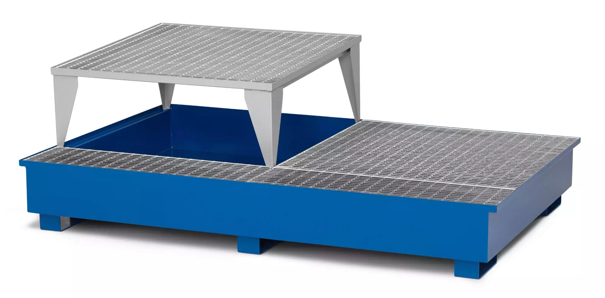 Product information "Sump tray type HTA-21 RAL 5010 made of steel with filling area for 2x 1000 litre IBC including 1x filling stand type RAB, WxDxH 2,560x 1,650x 880 mm, declaration of conformity according to StaWa-R, RAL 5010 gentian blue - Made in Germany"