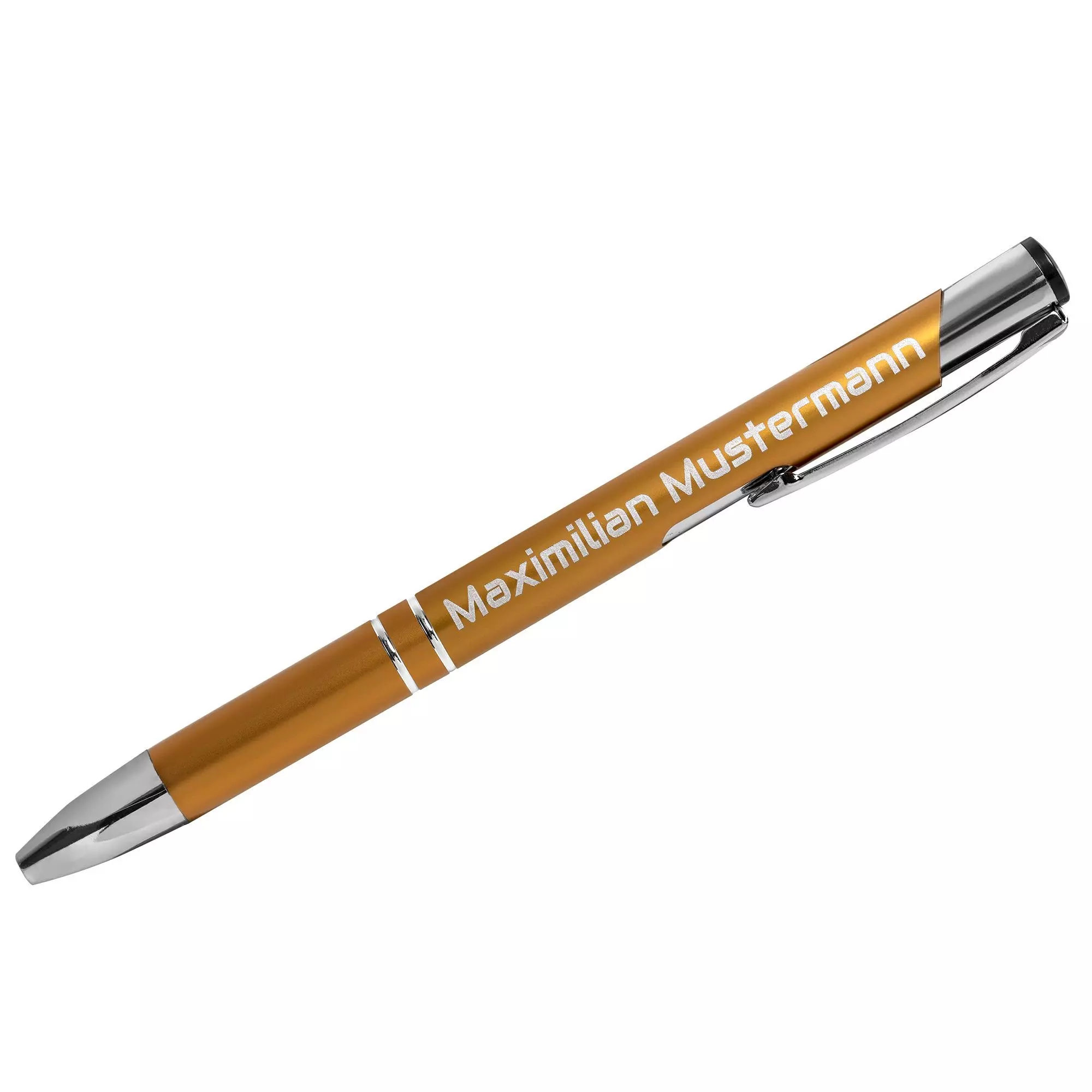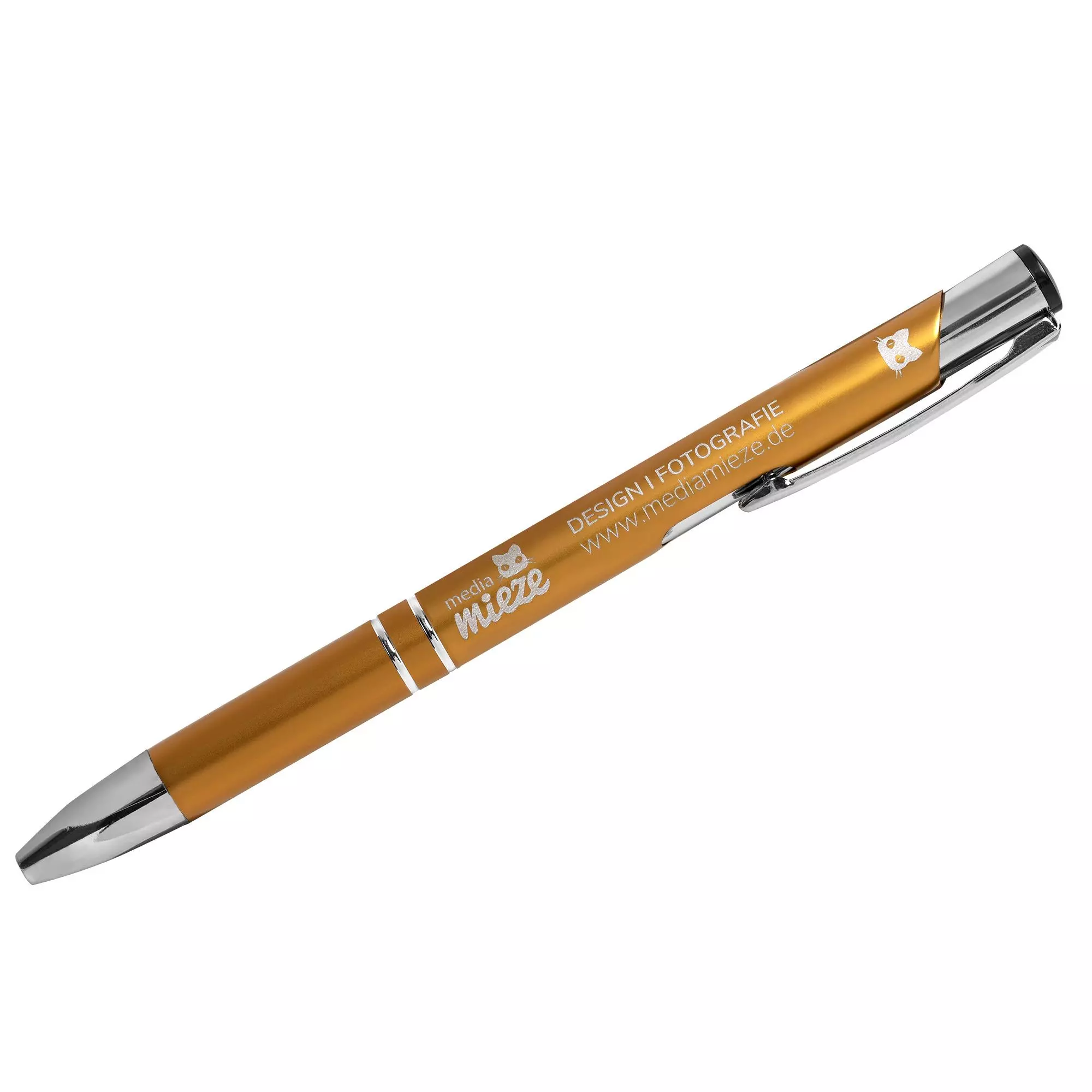 Información sobre el producto "Biros con grabado SIGNATURE ELEGANCE Grabado láser dorado Aluminio anodizado (200 bolígrafos) Ancho de trazo: M aprox. 0,6 mm Tinta: azul Con logotipo a petición"