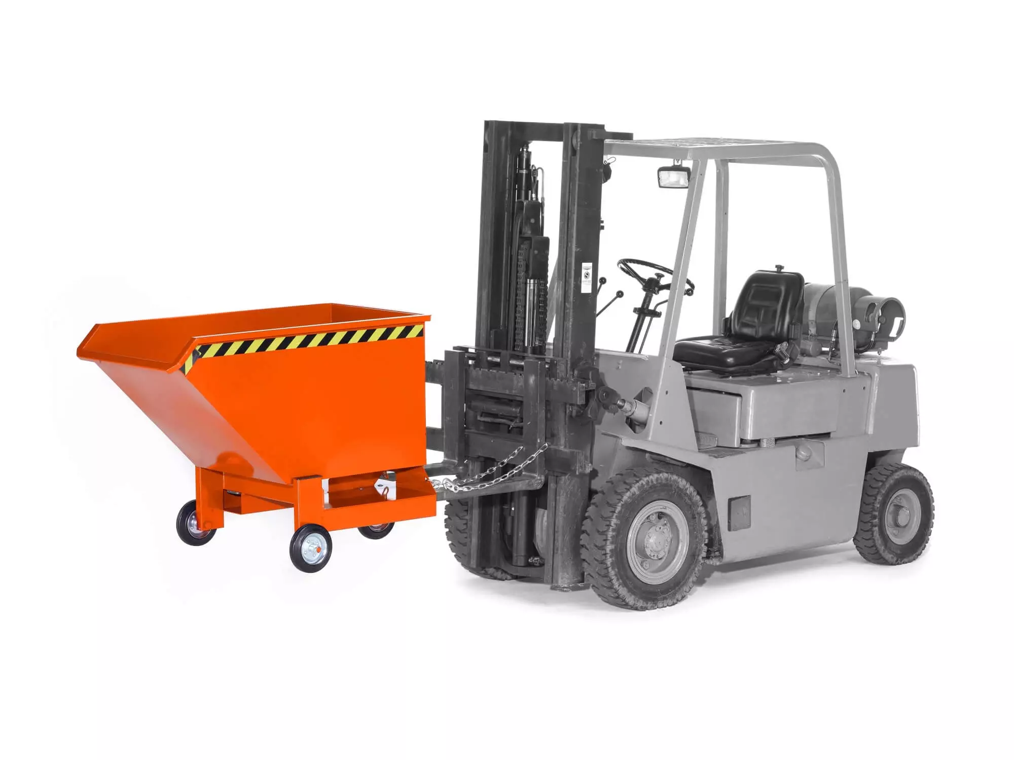 Informations sur le produit "Fourgon mobile avec entrées de fourches et roulettes Volume 0,4 cbm Capacité de charge 600 kg LxPxH 930x1440x1000 mm en RAL 2004 orange pur - Made in Germany"