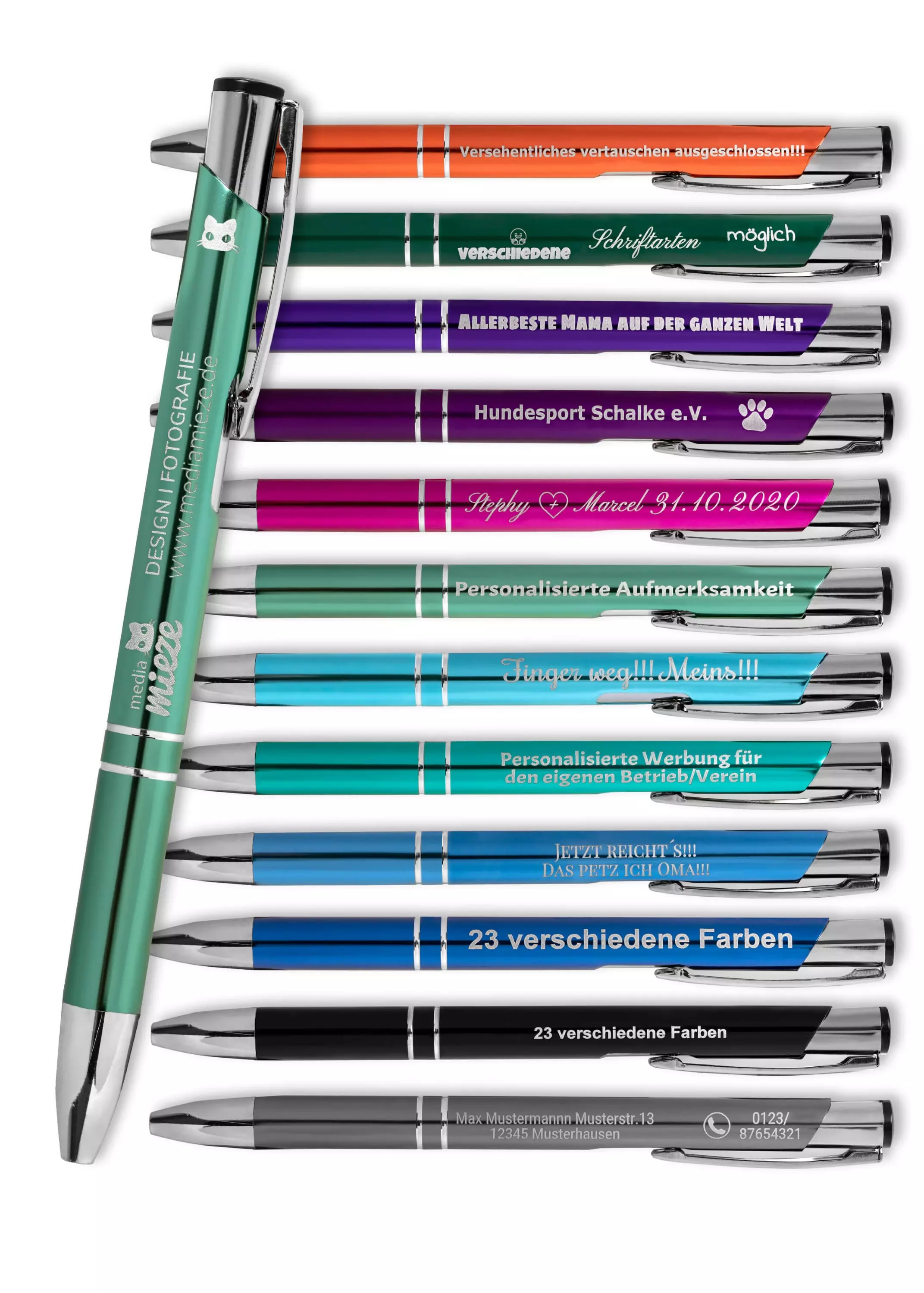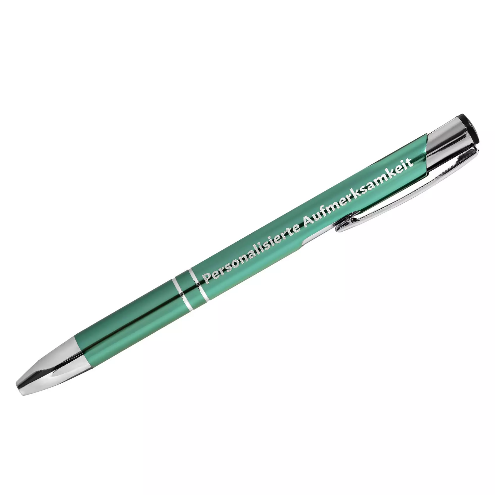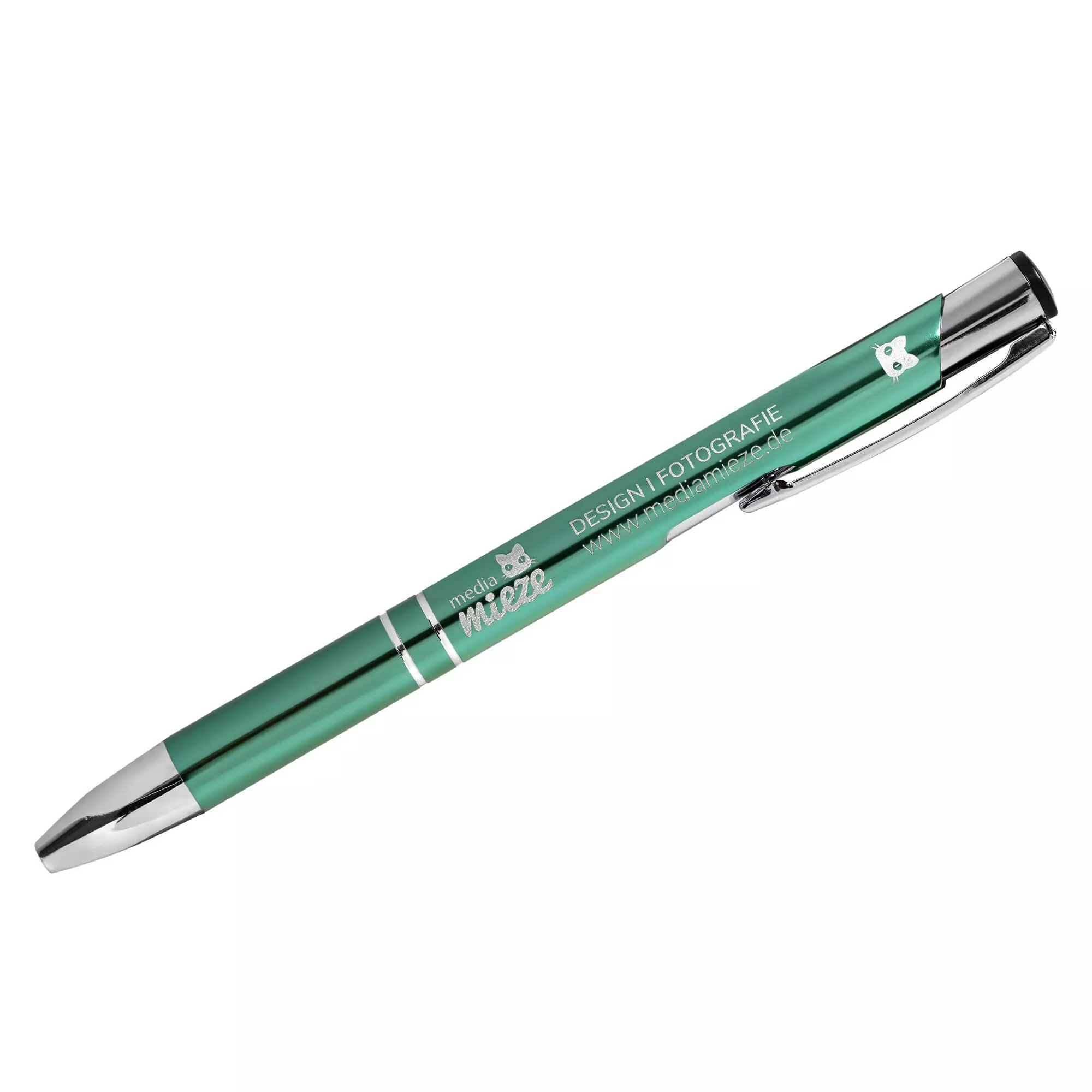 Produktinformation "Biros med gravyr SIGNATURE ELEGANCE Lasergravyr grön 0921C Anodiserad aluminium (50 st) Linjebredd: M ca 0,6mm Tusch: blå Med logotyp på förfrågan"